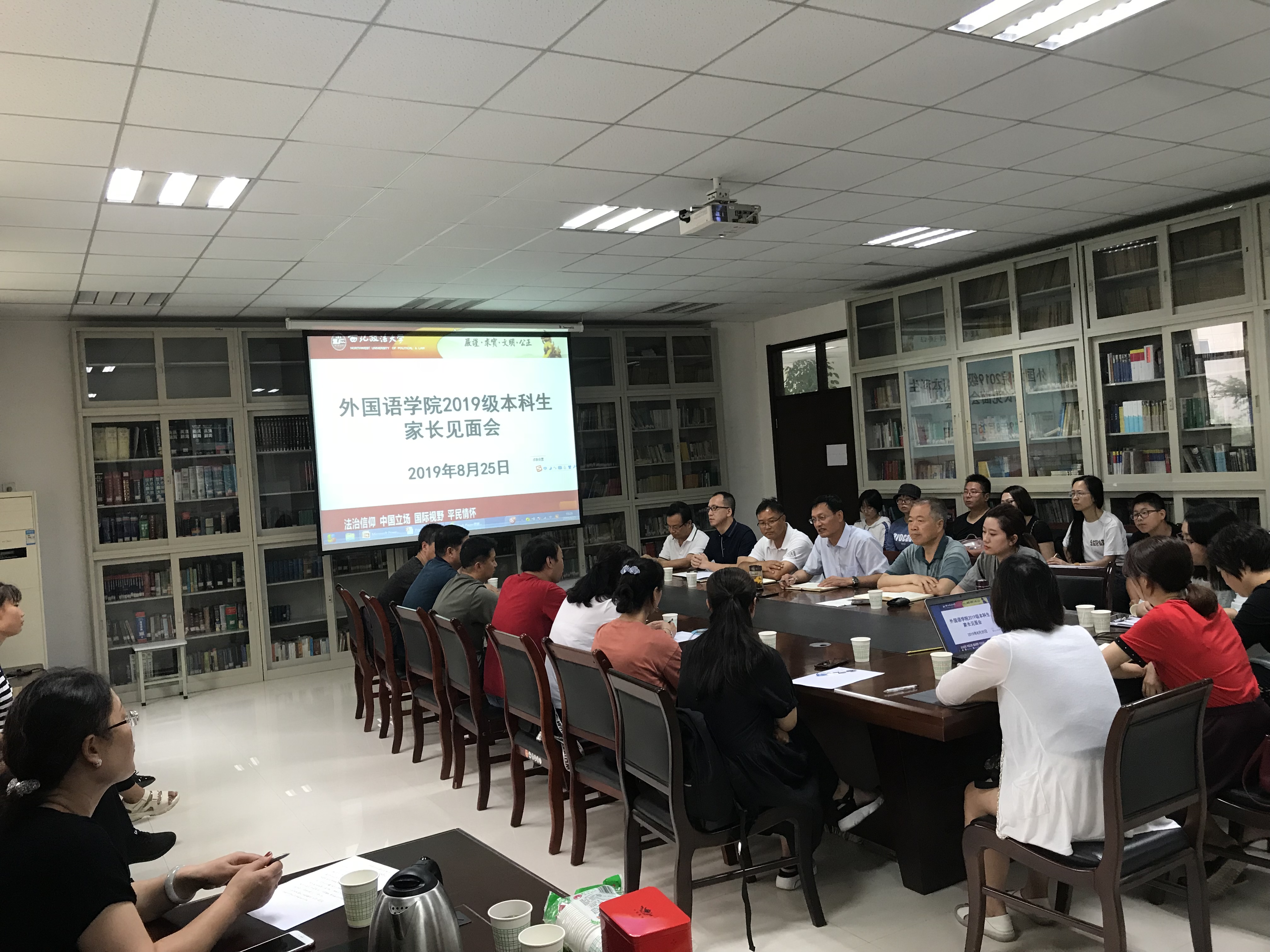 2019年8月25日上午10时整,公司2019级新生家长见面会在公司资料室顺利举行。出席见面会的有经理马庆林、党委书记姜建兴、副经理马腾、副经理陈河、党委副书记兼副经理吕凌、英语系主任樊养才、综合英语教研室主任秦婷、商务英语系副主任王颖平、法律英语教研室主任付巧、2019级辅导员吴晓娟以及部分2019级本科生家长及新生,共计50余人。