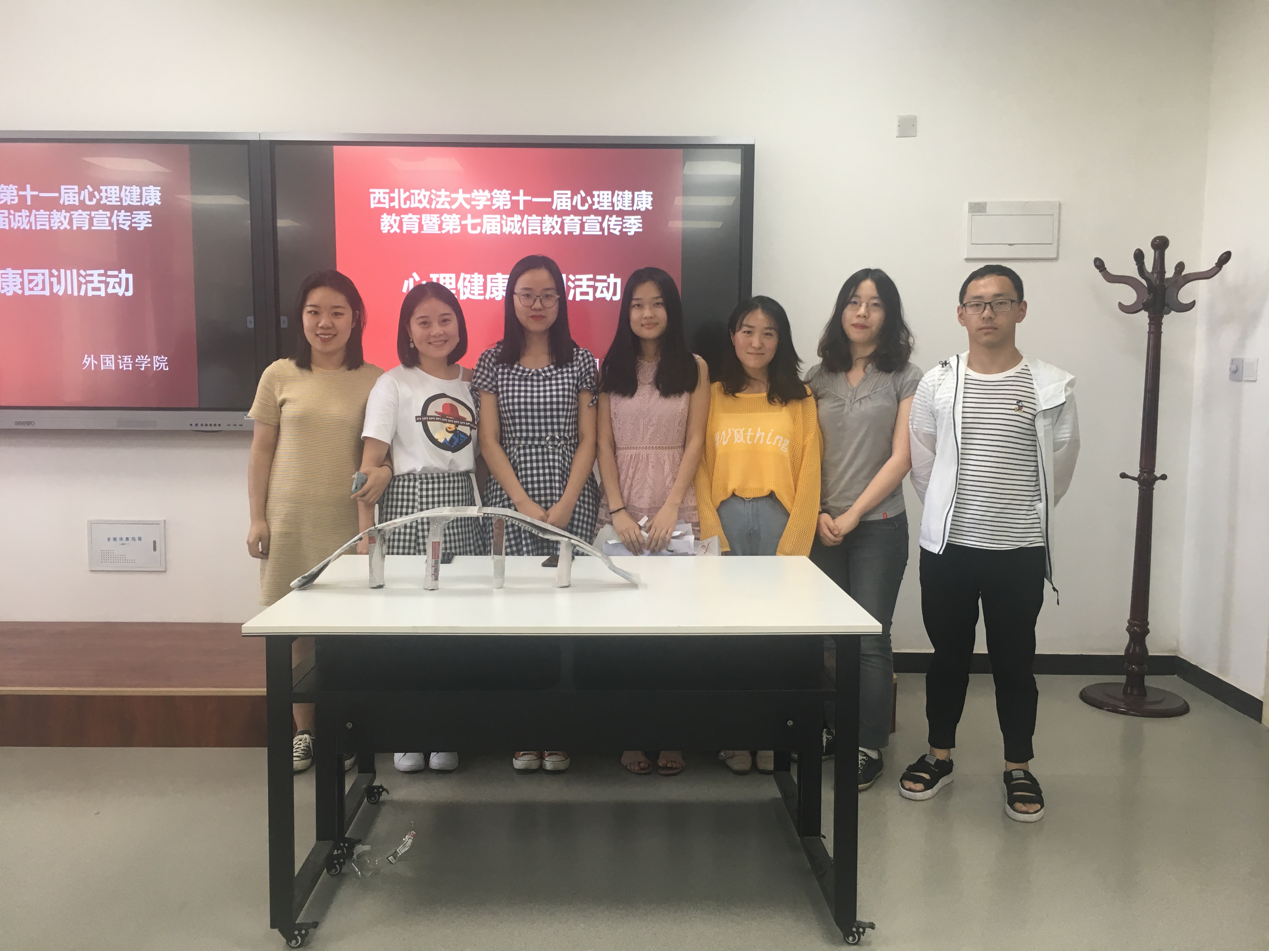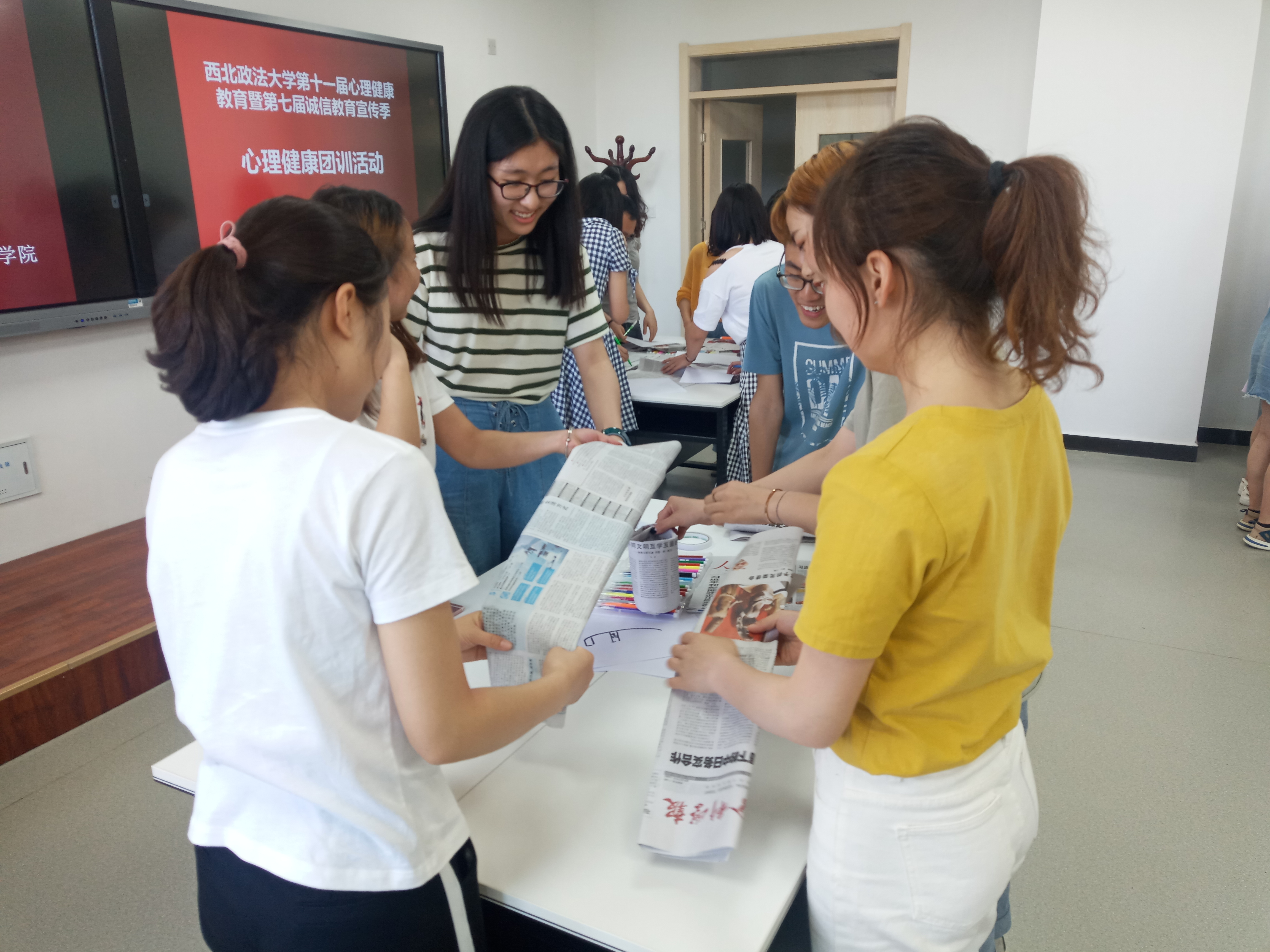 本次团训主题为“在团结协作中凝聚你我”。 团队任务是在限定时间内,团队成员在不用语言交流的情况下,合力用废旧报纸搭建制作一座桥。在进行了简单的热身游戏后,同学们分别组建自己的团队,充满信心地开始了紧张的制作,虽然不能用语言沟通,但在动作、眼神地默契配合下,大家智慧碰撞,失败中不抱怨不气馁及时汲取经验,历经周折,各个团队成员很快达成一致,在团结协作中圆满完成任务。整个团训过程同学们的参与积极性很高,尤其在分享环节,大家发言踊跃,每个团队都介绍了自己的作品,主动与他人分享自己在活动中的体会和收获,大家纷纷表示,任务成功的最大助力是“克服困难的毅力和良好的团队意识”,现场掌声不断。