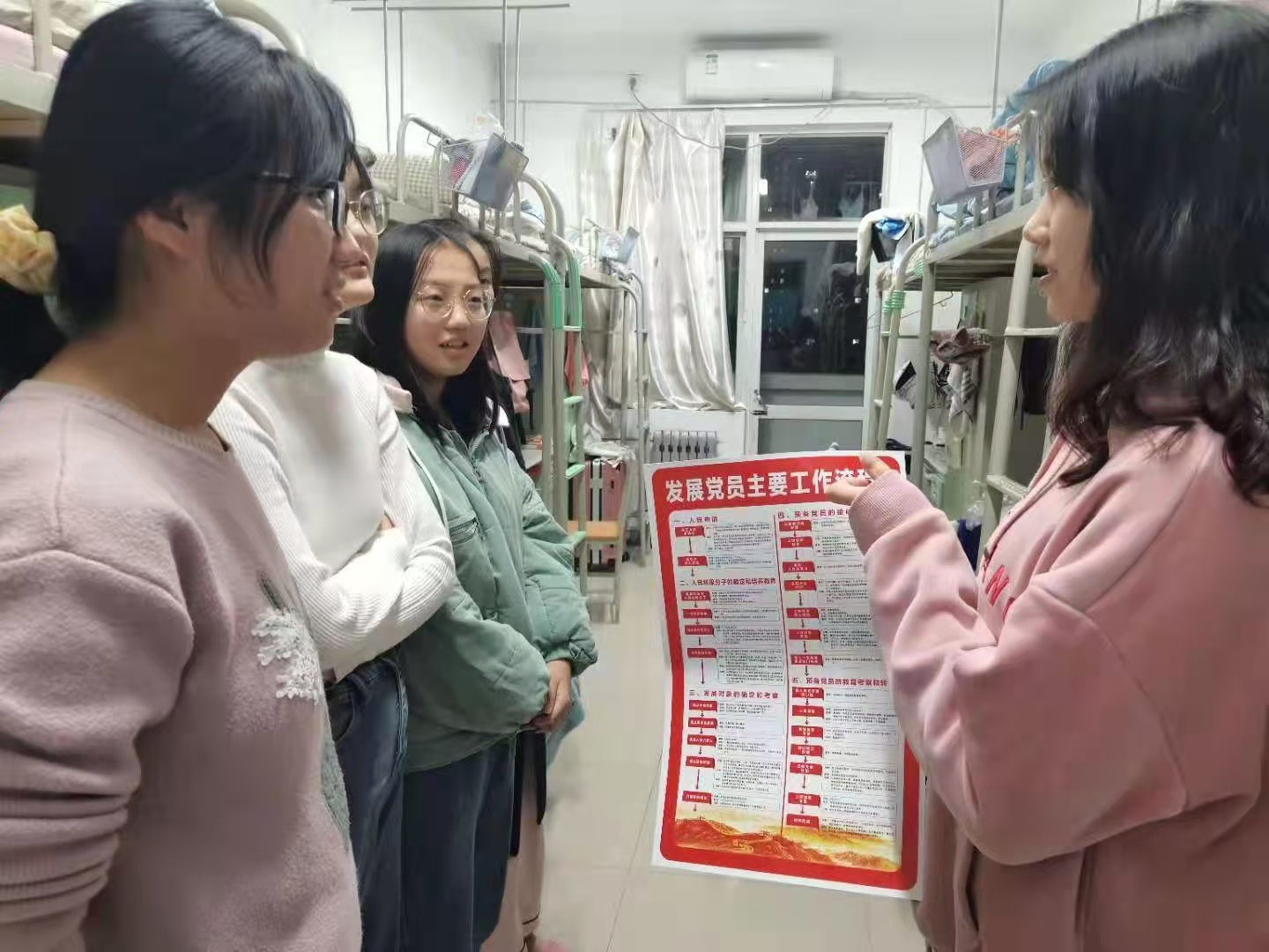 曾晴、张海萍、徐媛媛三名同学带着公司专门印制的入党流程宣传彩页来到新生宿舍受到了同学们的热烈欢迎。三位党员代表为大家说明了入党启蒙教育“微宣讲”活动的基本情况和活动目的,并耐心讲解了开展此项活动的必要性和重要意义。
