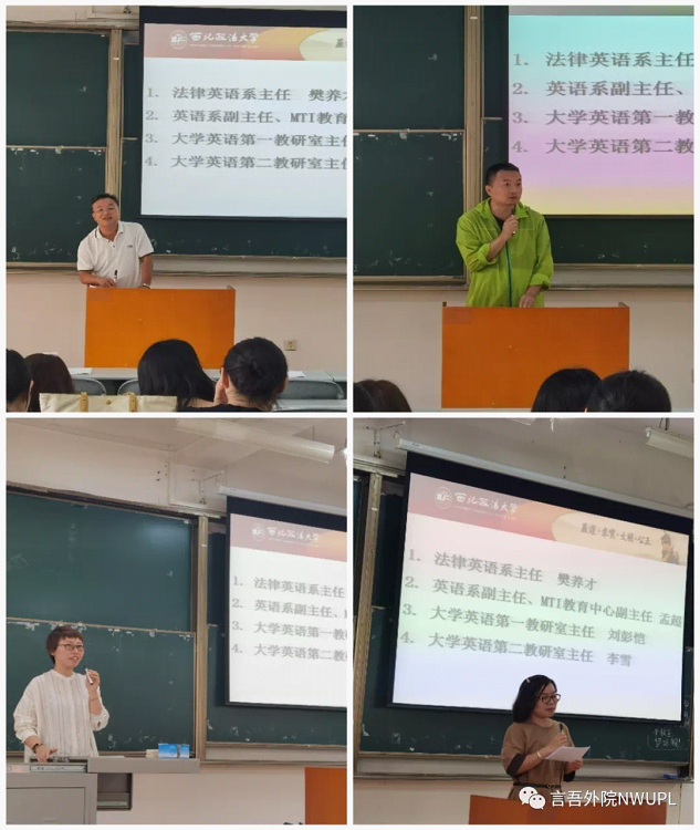法律英语系主任樊养才、法律英语系副主任、MTI教育中心副主任孟超、大学英语第一教研室主任刘彭恺、大学英语第二教研室主任李雪分别从加强辅导员工参加各级各类比赛获奖、加强培训员工四六级过关能力、完善教师听课机制、组织教师学习新教学技术、持续推进课程思政、深化课堂教学改革、完成慕课上线工作等方面依次汇报了本部门本学期的重点工作。