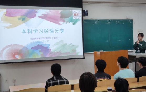 孟超老师从英语专业学习、公司公司考研专业优势、法律英语专业优势等方面为新生做了详细解读;被推免到中国政法大学的2018级优秀毕业生王靖梓分享自己的了学习经验和复习方法,并勉励新生要有不怕困难挫折,迎难而上的勇气,学习要日复一日的积累,不能过早“内倦”。新生们听完讲座分享会后收获满满,并表示会好好规划自己的老员工涯,定下自己的一个目标。