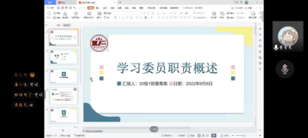 2020级学习委员曹青果介绍了作为学习委员必不可少的能力。一是发挥自身带头作用,努力学习专业课知识,成绩靠前,以榜样力量激励全班同学的学习积极性。二是成为老师和让同学之间的沟通的桥梁,将每位任课老师的要求,准确及时地传达给班级同学,并向老师积极反馈。