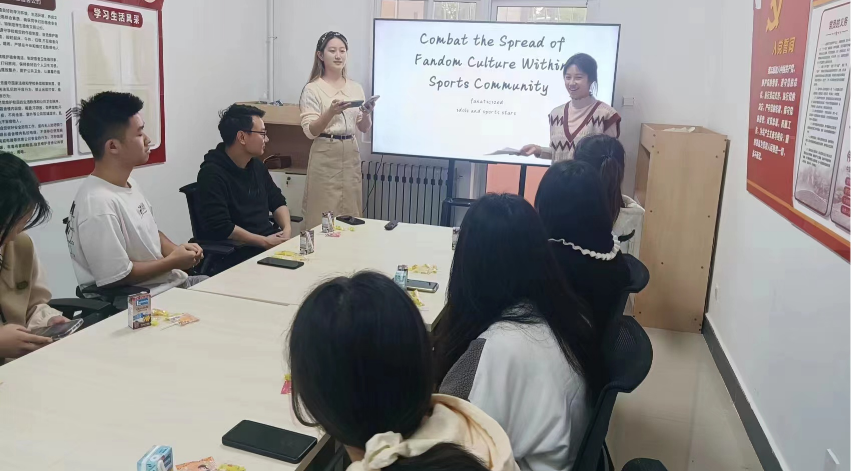 活动伊始,两位主持人以大家喜爱的明星引入本次活动主题,针对国内当下“体育圈饭圈化”进行了热烈讨论,现场气氛活跃,大家都积极思考踊跃发言。随后的自由讨论环节中,在高一波老师的带领下,同学们纷纷发表看法,认为体育圈饭圈化的这种行为确实不可采取,分别从政府以及个人两个方面谈及要理性对待追星问题。两位主持人也对体育界饭圈化的这种现象出现的原因进行了总结。