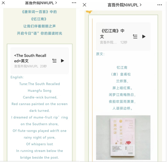 此次双语朗读选取了由中国著名翻译家许渊冲先生翻译的《唐宋词一百首》一书。在第一期“晨读有声 双语学习”系列活动中,由2023级的4位同学分别用中英文双语朗读了《踏鹊枝》《竹枝词》《忆秦娥》《长相思》等经典篇目。公司员工踊跃参与,认真准备,截止日前,公司微信公众号已连续推送10期。