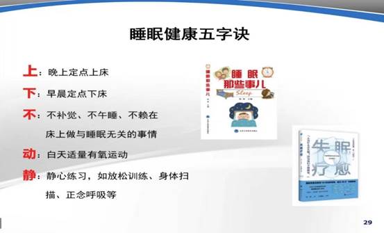 睡眠对人的身心健康的好处不言而喻,但失眠对人体危害极大。范滕滕老师围绕失眠障碍管理进行了多方面的阐述,主要有:失眠障碍的诊断标准,失眠障碍的治疗误区,不良认知的纠正以及失眠障碍的心理治疗。强调要通过调整生物钟,增加睡眠驱动力、身心放松等方式缓解失眠,并通过自己治疗失眠患者的经验,为大家总结了睡眠健康五字诀:“上下不动静”。