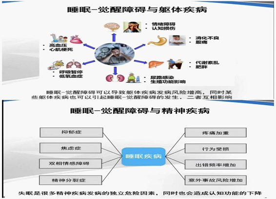 范老师首先对睡眠-觉醒障碍与躯体疾病进行了分析说明,讲到睡眠不足会增加患心血管疾病的风险,还会导致躯体疾病发病风险增高;进一步分析了睡眠-觉醒障碍与精神疾病,抑郁症、焦虑症、双相情感障碍、精神分裂症等多种心理疾病与睡眠问题息息相关。
