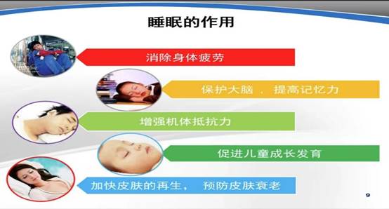 其次,范老师对不同睡眠时相的特点、睡眠周期的变化、睡眠随年龄的变化以及一些常见的睡眠疾病进行了解释,得出了睡眠的五大作用。