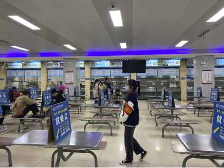 每日就餐高峰期前,公司志愿者统一佩戴好口罩和红袖章,身着志愿者马甲,分别在食堂、超市入口等人员易聚集、人流量较大的场所值守巡逻。员工志愿者们坚守在自己的岗位,引导同学进入超市、食堂前扫一码通,提醒佩戴口罩,劝导同学们在在用餐时隔位就座,引导大家在窗口排队的过程中保持一米间距,做好防护,确保食堂就餐环境文明有序。