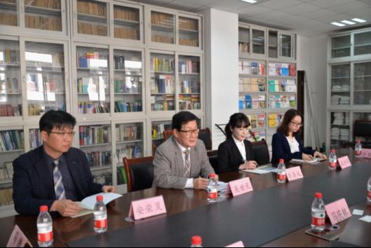 马庆林经理代表公司对吴世天一行表示热烈欢迎,随后介绍公司历史及朝鲜语专业情况,并就朝鲜语专业员工就业方向进行讨论。