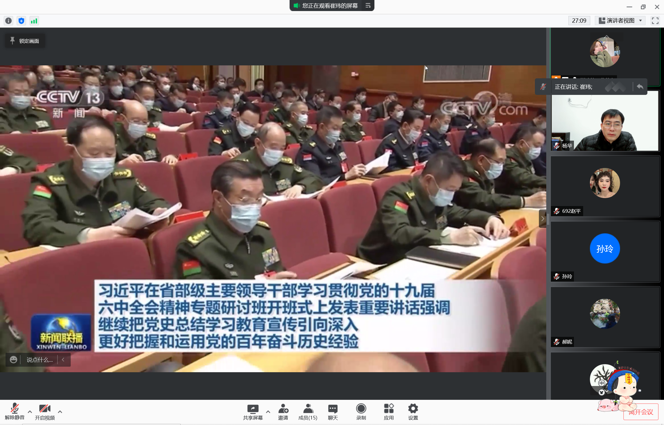 参会成员就学习内容展开了交流研讨。大家一致认为,习近平总书记2022年新年贺词深情回顾中国共产党百年奋斗的光辉历程,着眼实现中华民族伟大复兴的宏伟目标,深受鼓舞、倍感振奋。要增强“四个意识”、坚定“四个自信”、做到“两个维护”,深刻理解习近平总书记重要讲话的精神实质、丰富内涵,深刻领会“两个确立”的决定性意义。