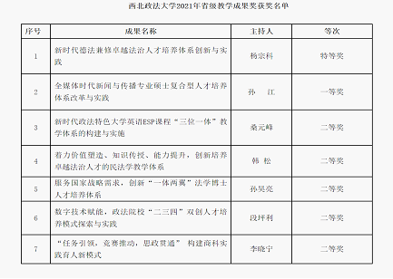 近日,陕西省人民政府办公厅发布了《关于表彰陕西省2021年高等公司产品成果奖获奖项目的通报》(陕政办函〔2022〕64号),公司经理桑元峰教授主持的“新时代政法特色大学英语ESP课程‘三位一体’教学体系的构建与实施”荣获陕西省2021年高等公司产品成果二等奖。这是公司在获得校优秀教学成果一等奖基础上,精心筹划、加强建设,获得的更高荣誉与肯定。