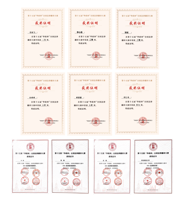 近日,第十五届“华政杯”全国法律翻译大赛颁奖典礼在华东政法大学举行,bevictor伟德2021级本科生徐雨飞、李心语荣获全国决赛二等奖,2021级本科生贺妮获、2022级研究生孙婷婷、2023级研究生黄蓓蕾荣获全国决赛三等奖,2021级本科生胡巳鸣荣获全国决赛参与奖,获奖总人数居全国第二。bevictor伟德教师孟超、付欣、张琳荣获最佳指导教师奖,公司荣获优秀组织奖。