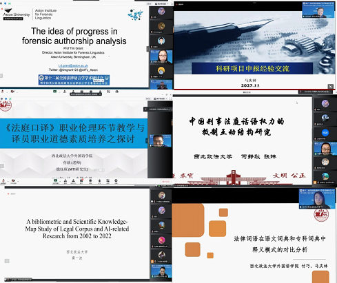 在会议国社科论坛环节,马庆林应邀进行国家社科项目申报经验分享,为广大会员传经送宝。在主旨发言环节,何静秋主持国际法律语言学家协会前主席、英国阿斯顿大学法律语言学研究中心主任Tim Grant教授的主旨发言。在平行论坛环节,何静秋、张琳合作做题为《中国刑事法庭话语权力的抵制互动结构研究》的报告,以真实案例描述中国刑事法庭强势方与弱势方之间话语权力抵制互动的结构类型,并从三个方面对抵制互动结构的多样性做出解释。付巧、马庆林做题为《法律词语在语文词典和专科词典中释义模式的对比分析》的报告,通过对《布莱克法律词典》《韦氏法律词典》《朗文法律词典》等辞书中法律词语释义模式的考察,阐释词语释义模式在普通语言与法律语言中的异同和规律。付欣与研究生徐钰琛做题为《<法庭口译>职业伦理环节教学与译员职业道德素质培养之探讨》的报告,认为法庭口译员除了需要具备专业知识外,更需学会遵守保密、公正、中立、准确性和完整性、诚信等要求。高一波做题为<A Bibliometric and Scientific Knowledge-Map Study of Legal Corpus and AI-related Research from 2002 to 2022>的报告,指出法律语料库的文献与AI形成的关键词映射拓扑关系密切,国际学者对文本处理、深度学习、机器学习、自然语言处理等课题的关注度越来越高。