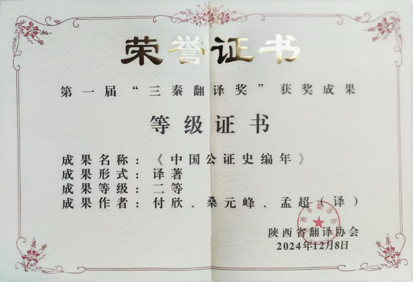 12月8日,陕西省翻译协会公布第一届“三秦翻译奖”获奖名单,我院付欣、桑元峰、孟超等三人翻译出版的英文译著A Chronicle of China’s Notary History (1902–1979)(中文译名:《中国公证史编年》)位列著作类第三名,荣获二等奖。
